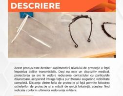 Acest produs este destinat suplimentarii nivelului de protectie a fetei impotriva bolilor transmisibile. Desi nu este un dispozitiv medical, proiectarea sa are in vedere reducerea contactului cu particulele daunatoare, acoperind intreaga fata a purtatorului, asigurand vizibilitatea completa. Distanta dintre folia de protectie si fata perite folosirea ochelarilor de protectie si a masti de unica folosinta, acestea fiind indicate conform ultimelor ordonante militare.